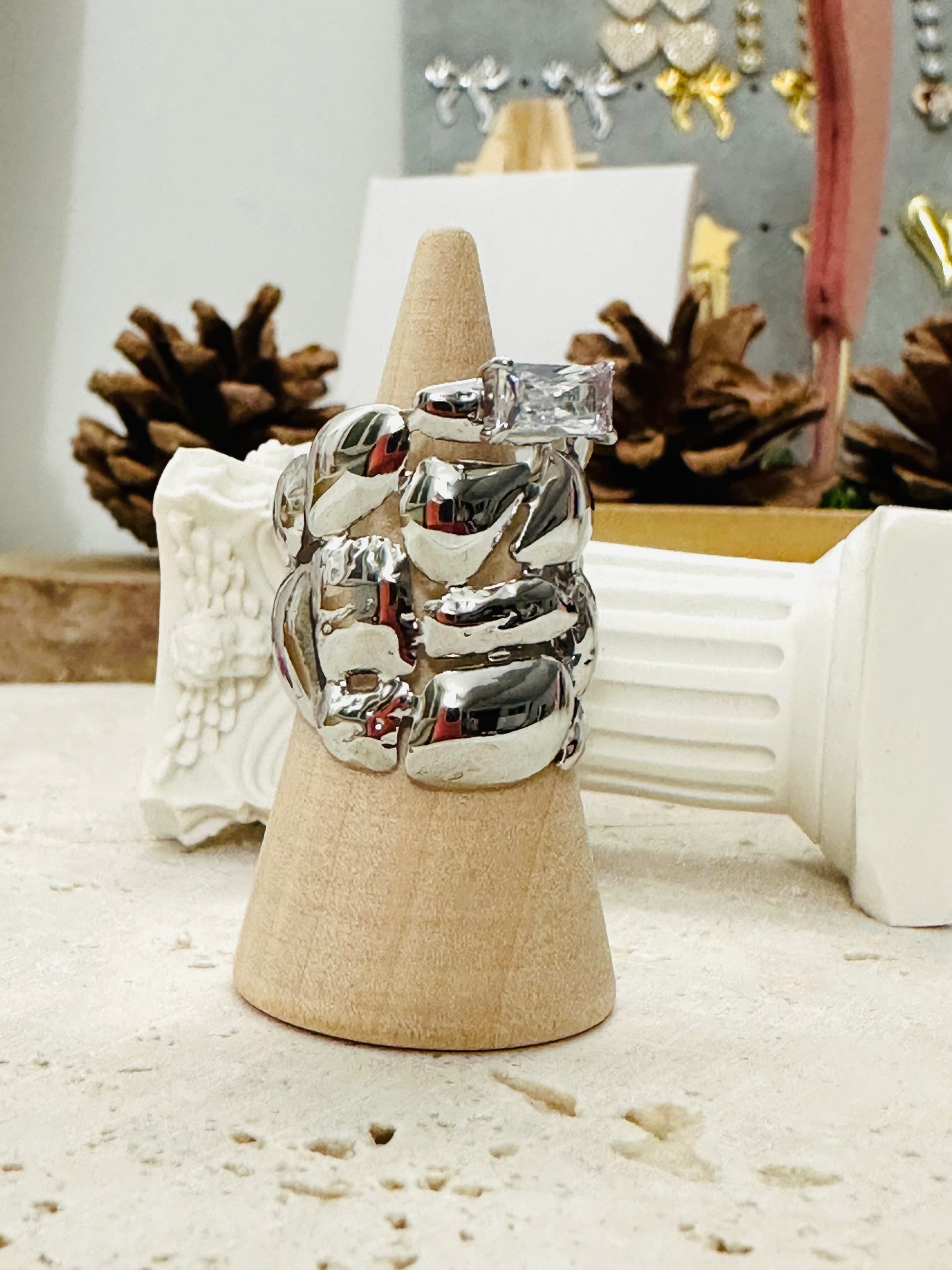 Al centro, un zircone rettangolare cattura la luce con riflessi decisi, rendendo questo anello il protagonista assoluto di ogni look.