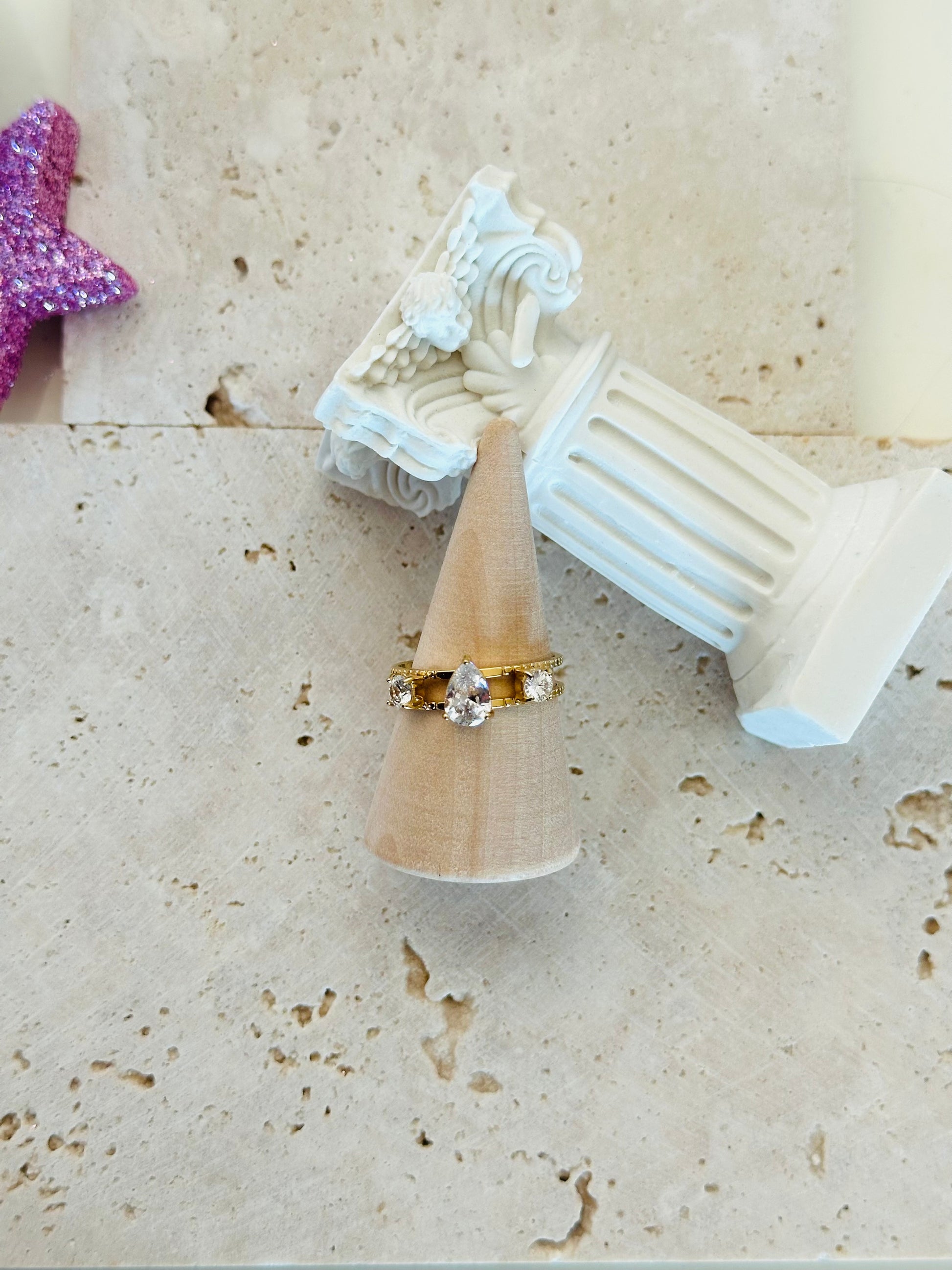 Realizzato in acciaio inox di alta qualità, questo anello presenta un design raffinato e bilanciato: ai lati, due zirconi tondi brillano con purezza, mentre al centro spicca un zircone a goccia, simbolo di grazia e femminilità.