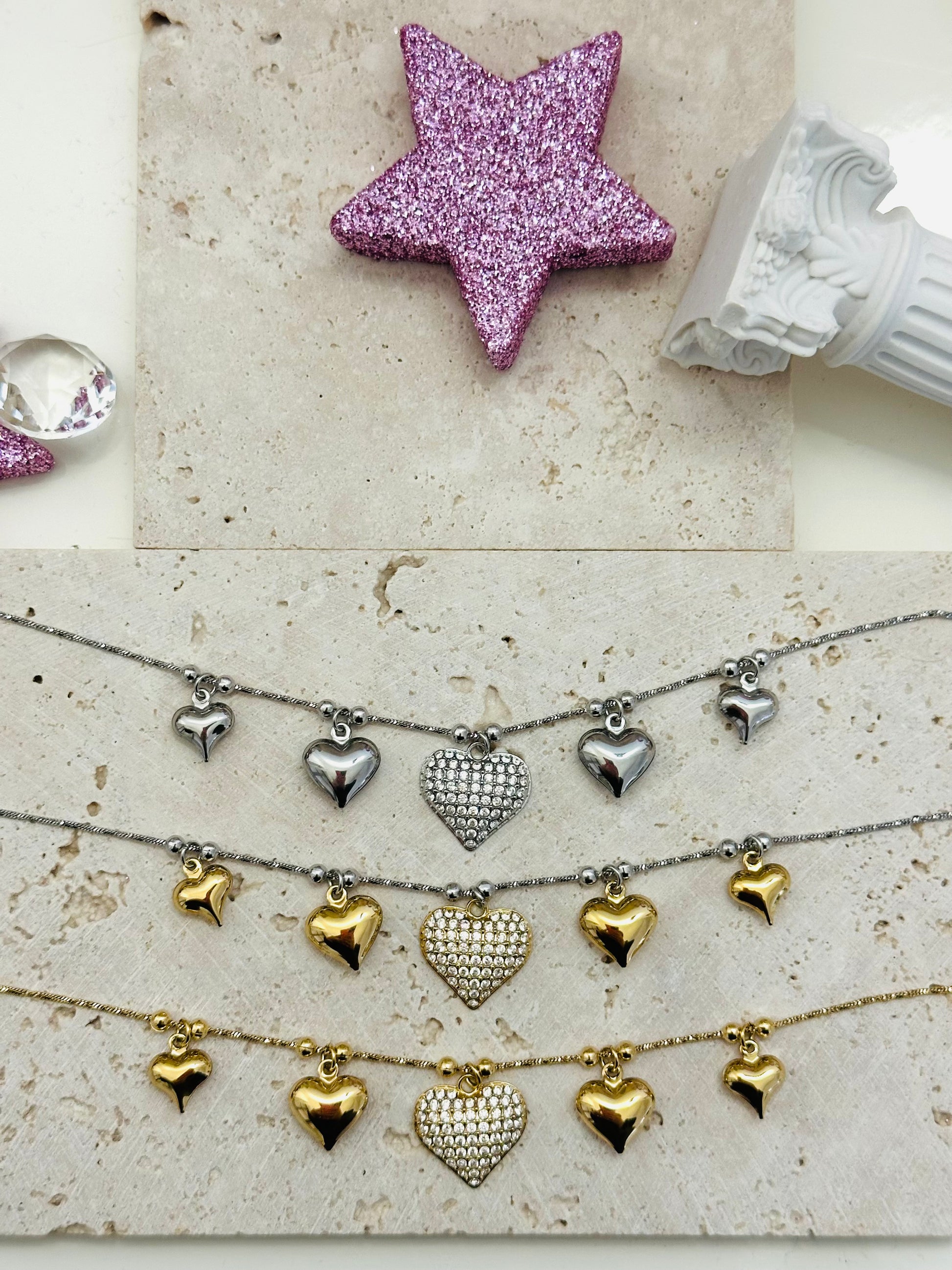 Bracciale in acciaio inossidabile con cuori pendenti sonagli e cuore centrale con zirconi luminosi.