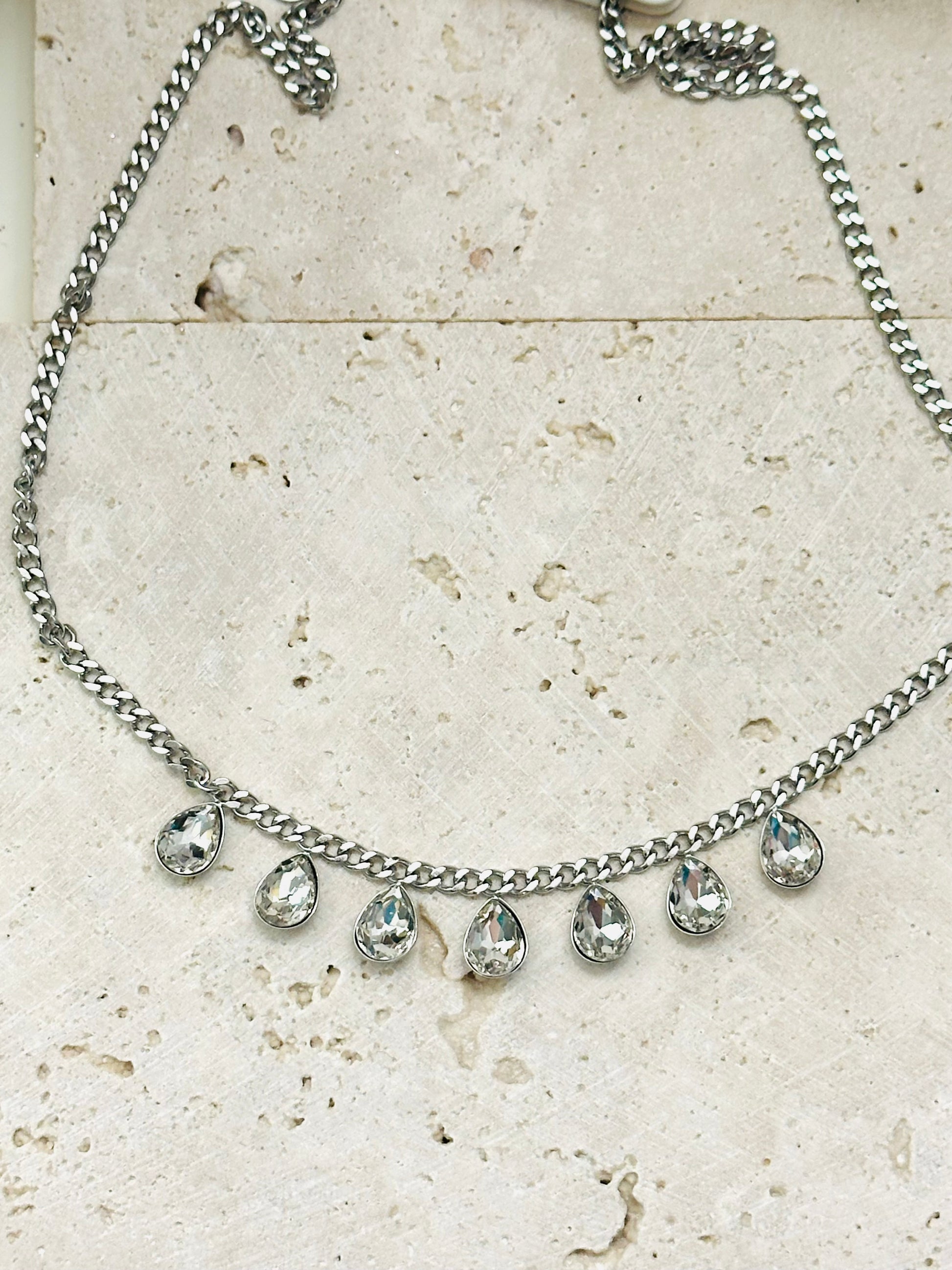 Realizzata in acciaio inossidabile di alta qualità, questa collana presenta una catena fine e delicata, impreziosita da zirconi pendenti a forma di goccia, che catturano la luce a ogni movimento e illuminano il décolleté con una brillantezza sofisticata.