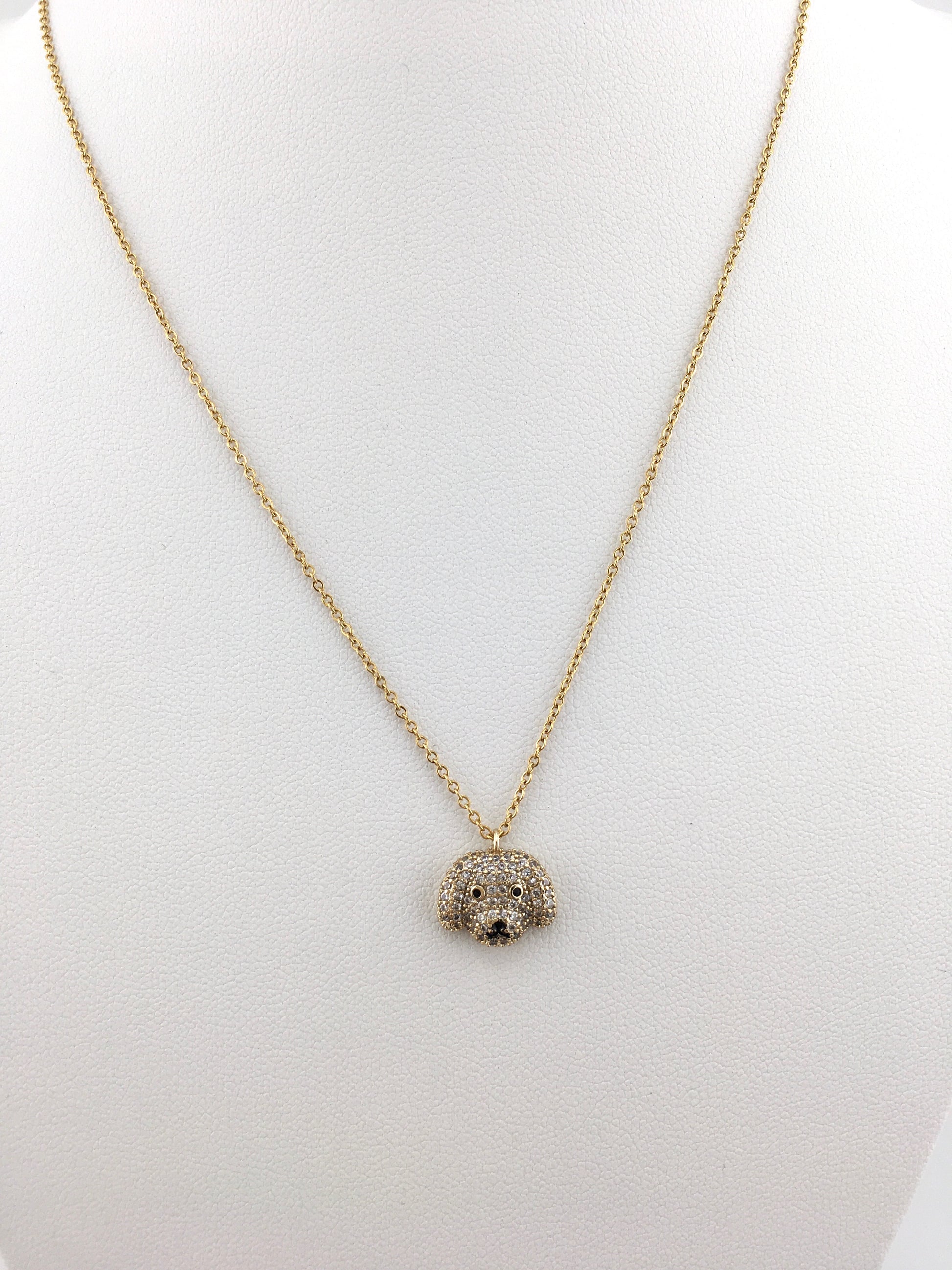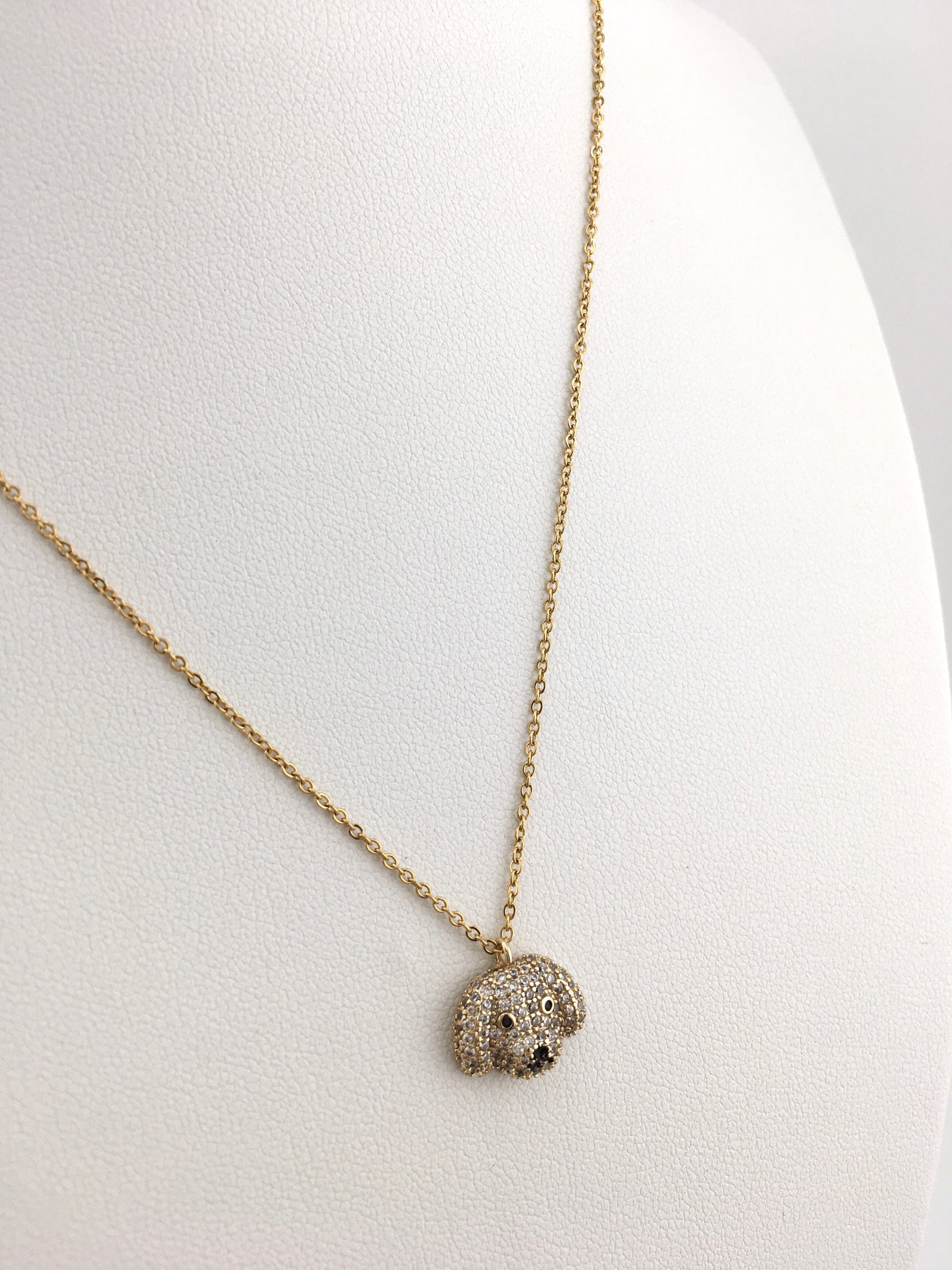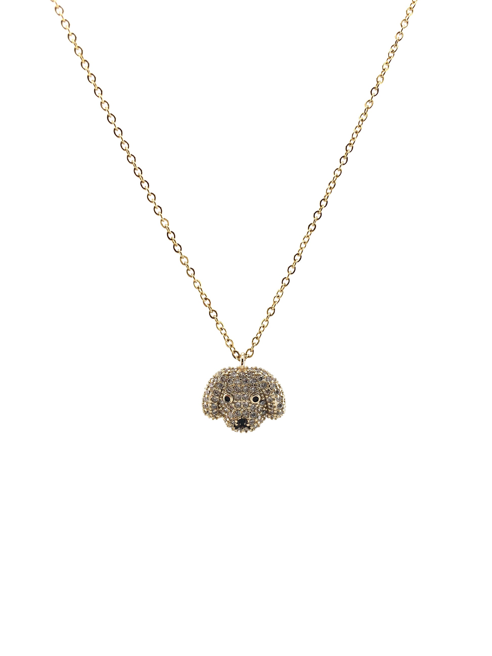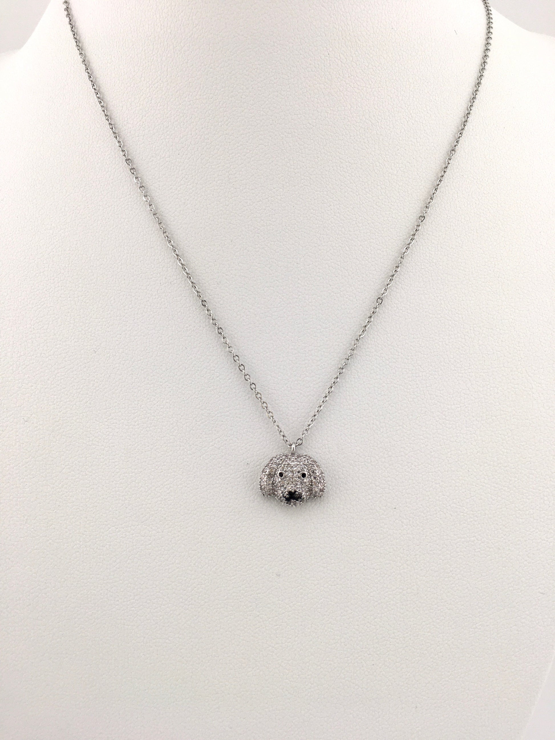 Deliziosa collana in acciaio inox, arricchita da un pendente a forma di musetto di cagnolino interamente ricoperto di zirconi luminosi.