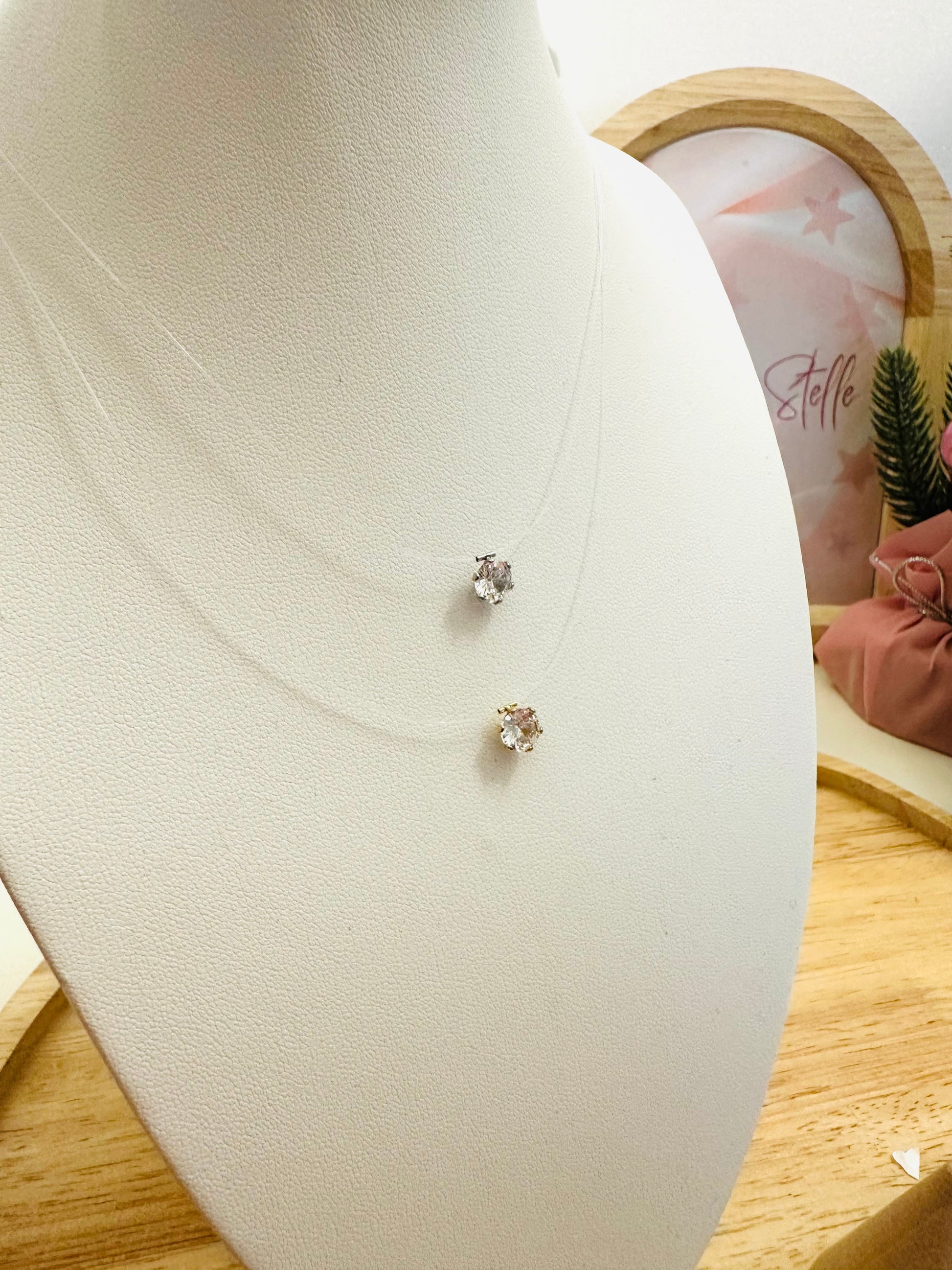 Una Collana raffinata e minimalista, caratterizzata da un filo trasparente che sembra scomparire sulla pelle, mettendo in risalto un brillante punto luce.
