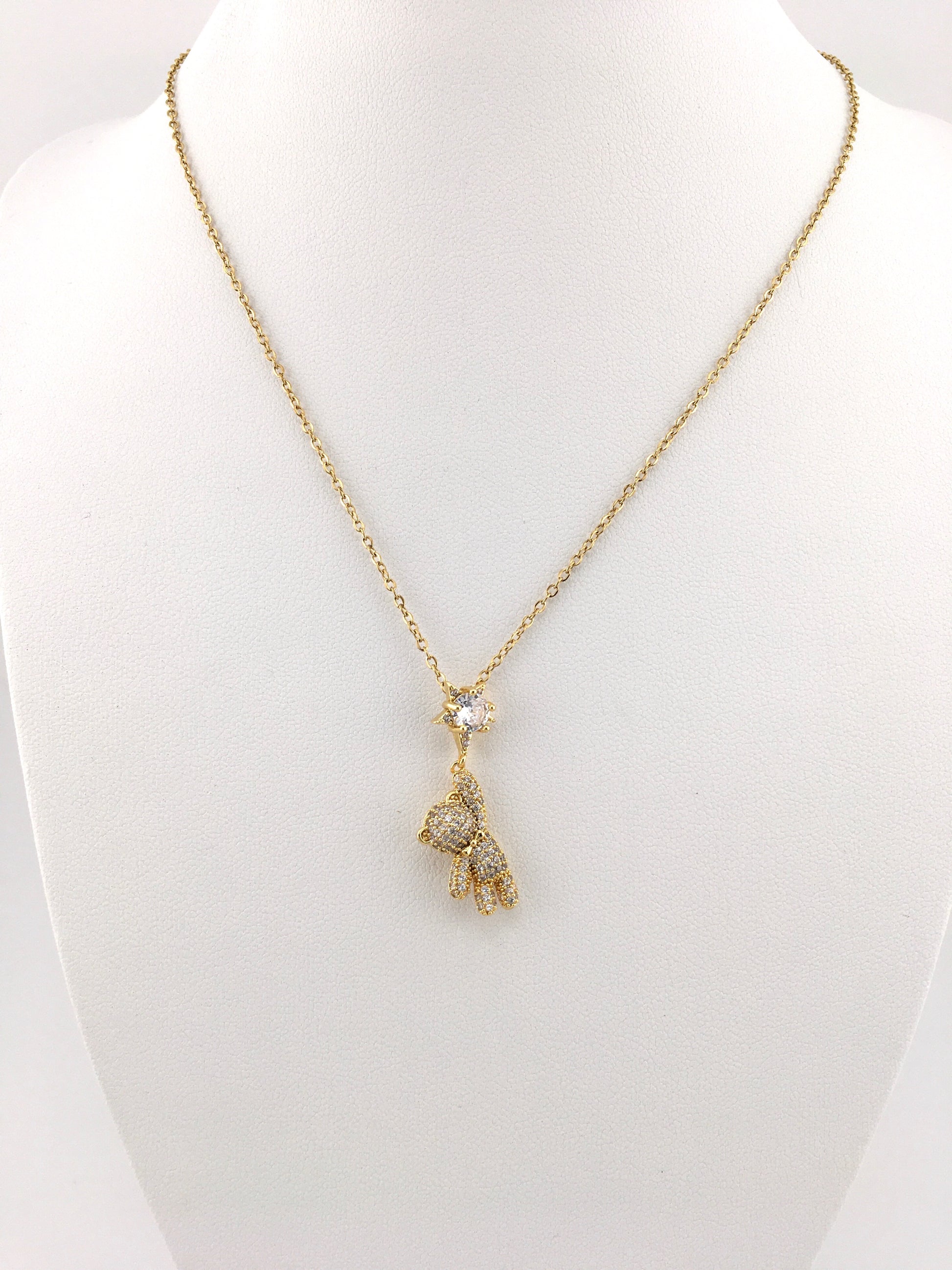 Realizzata in acciaio inox, presenta un elegante pendente a forma di stella completamente zirconata, da cui è delicatamente appeso un piccolo Teddy impreziosito da zirconi scintillanti, per un effetto raffinato e irresistibile.