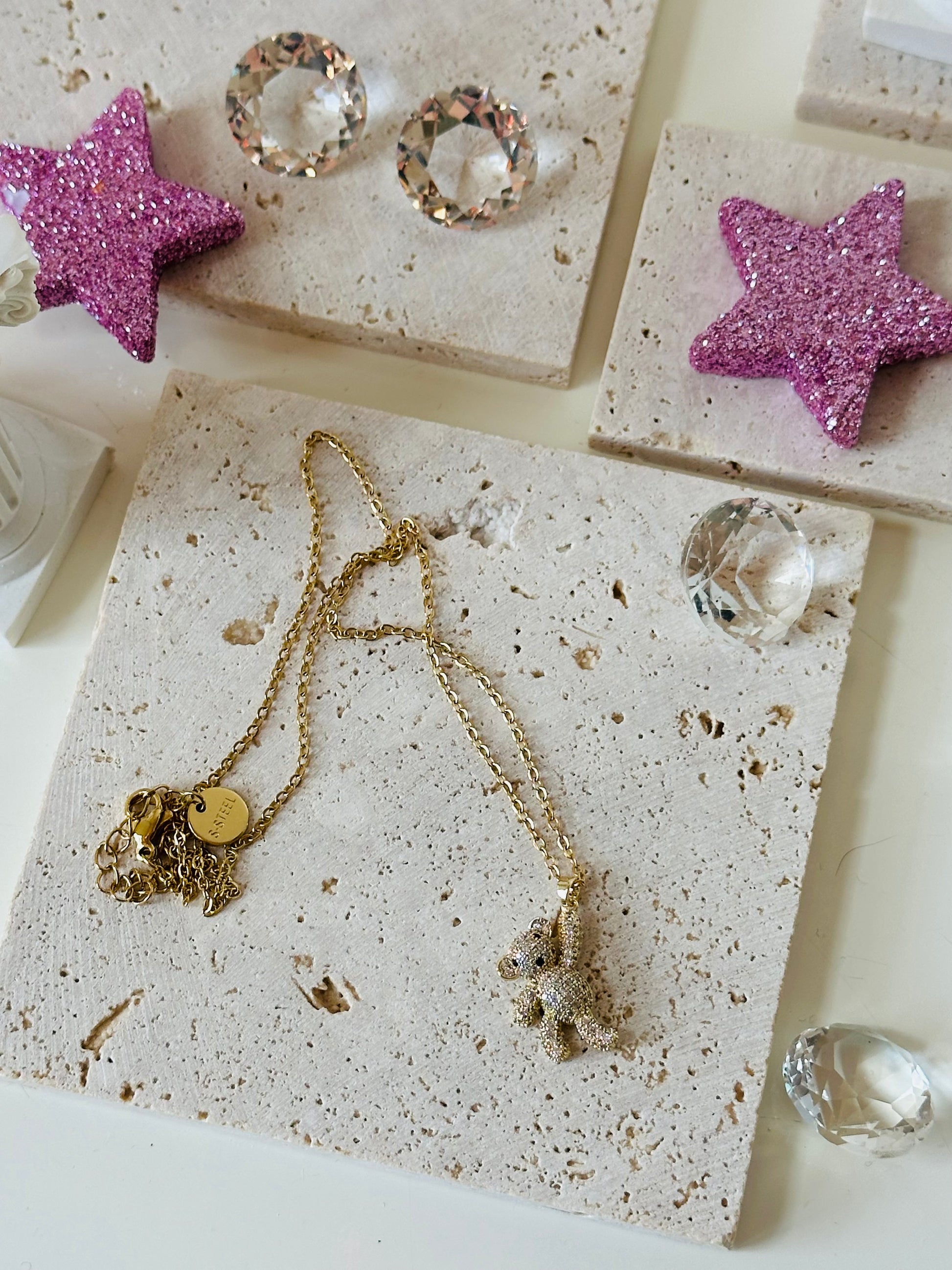 Realizzata in acciaio inossidabile anallergico, il pendente a forma di orsetto Teddy( in ottone e zirconi), rappresenta l’infanzia, la protezione e i sogni che brillano anche quando si cresce.