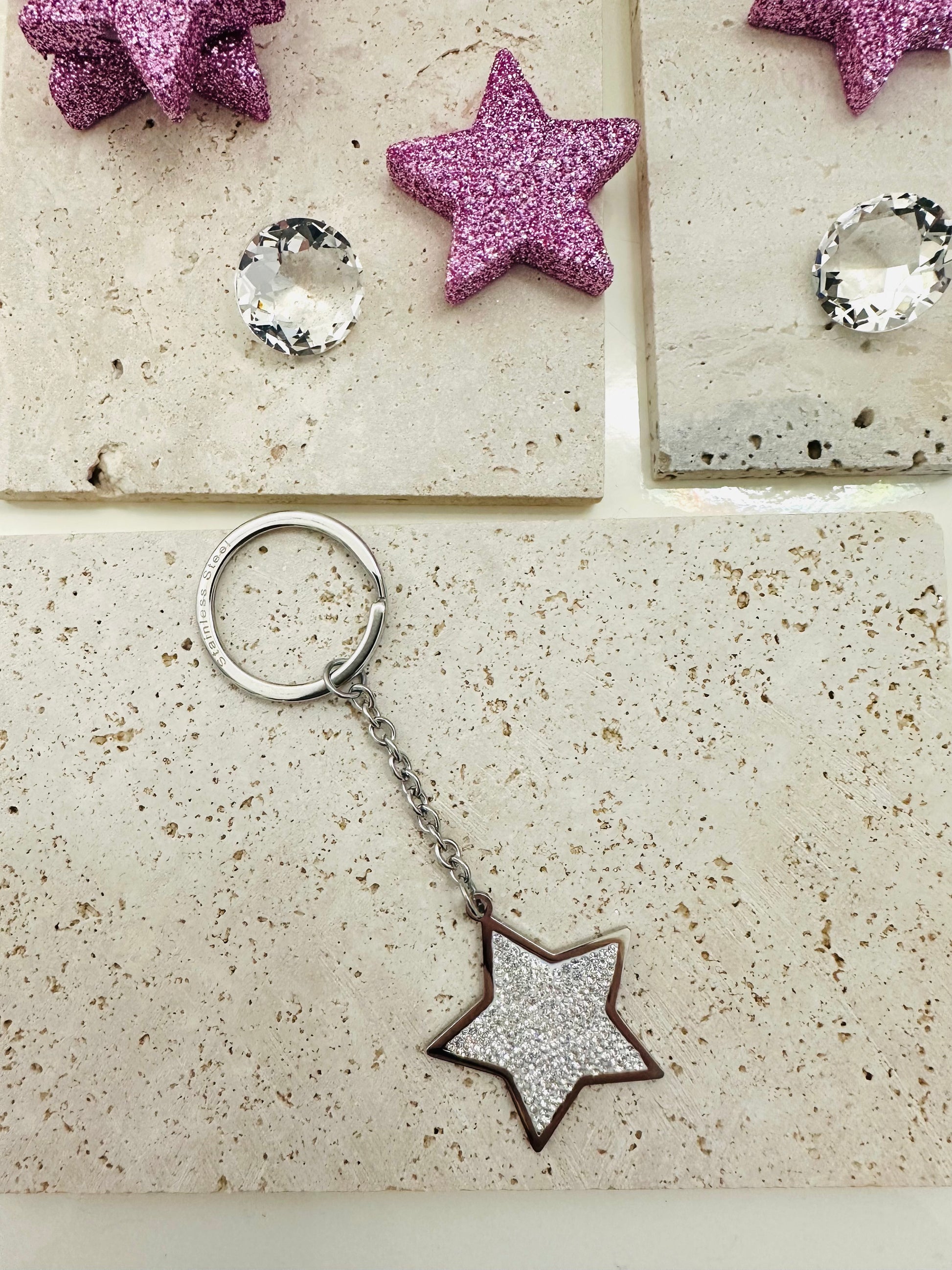 Portachiavi Charm borsa in acciaio con stella zirconata